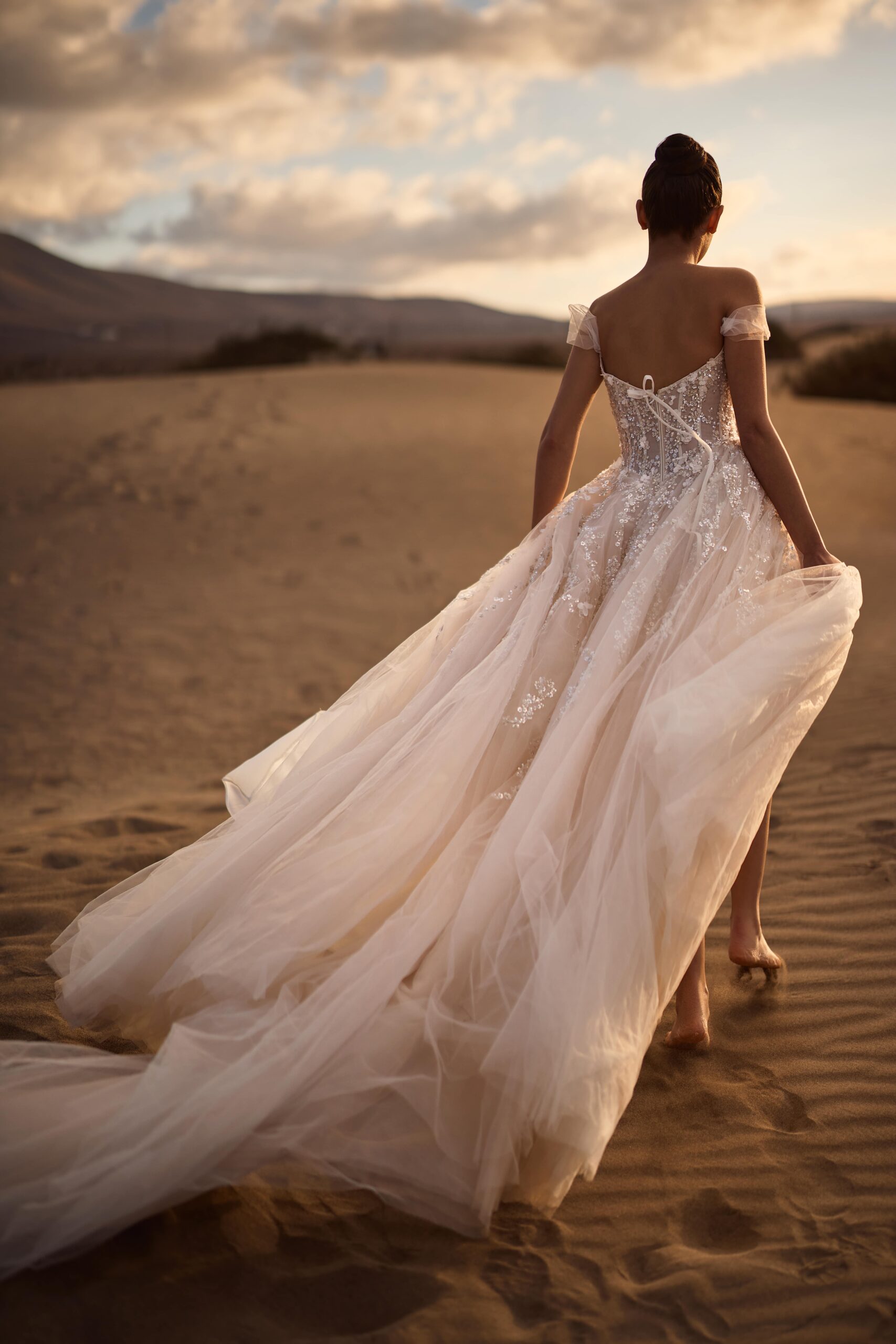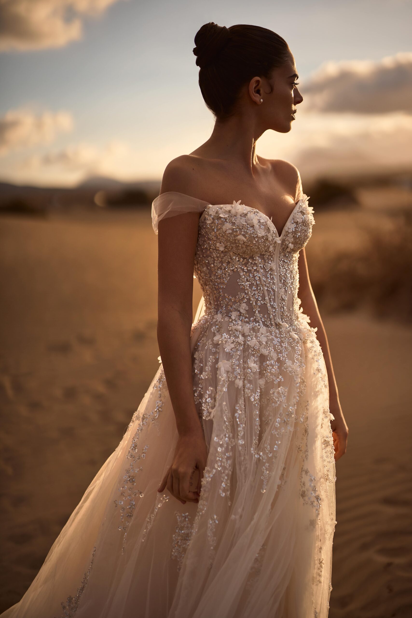 Romantic tulle wedding dress embroidered with sequins and flowers. Off the shoulder sleeves and a sweetheart neckline. Slit at the thigh and a flowing skirt with a train.