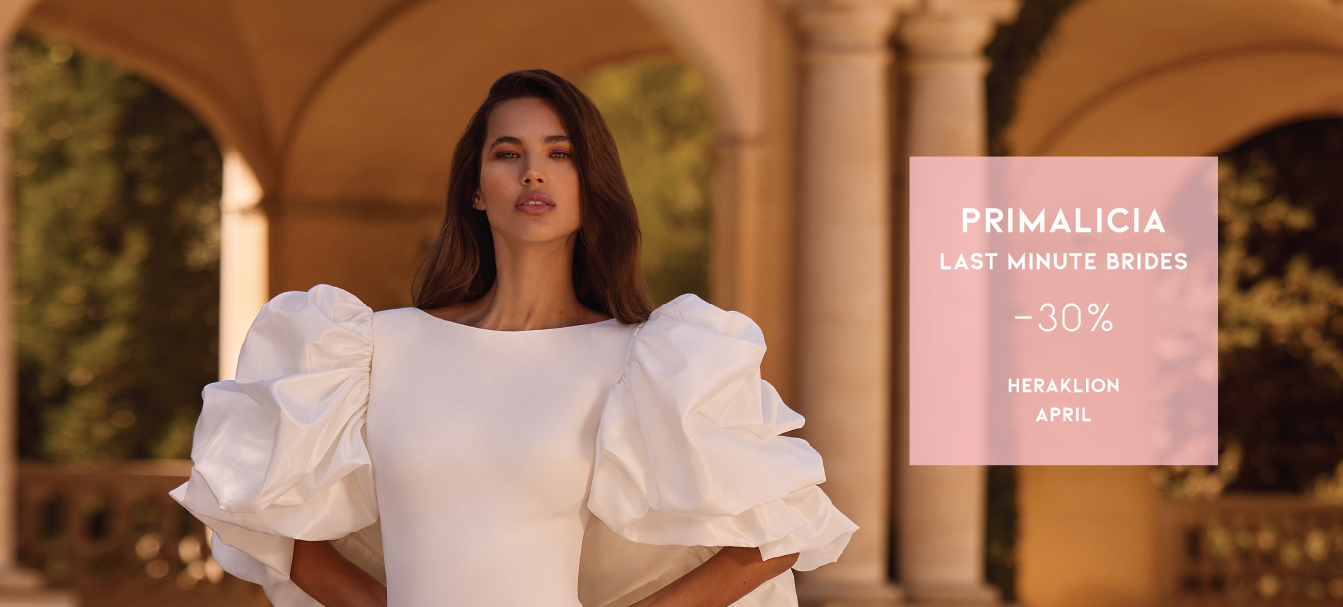 Primalicia Last Minute Brides 2026 προλαβαίνετε! Με έκπτωση 30% στις νέες μας συλλογές, σας περιμένουμε στην Primalicia Κρήτης, στο Ηράκλειο, για να βρούμε μαζί το νυφικό των ονείρων σας!