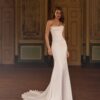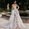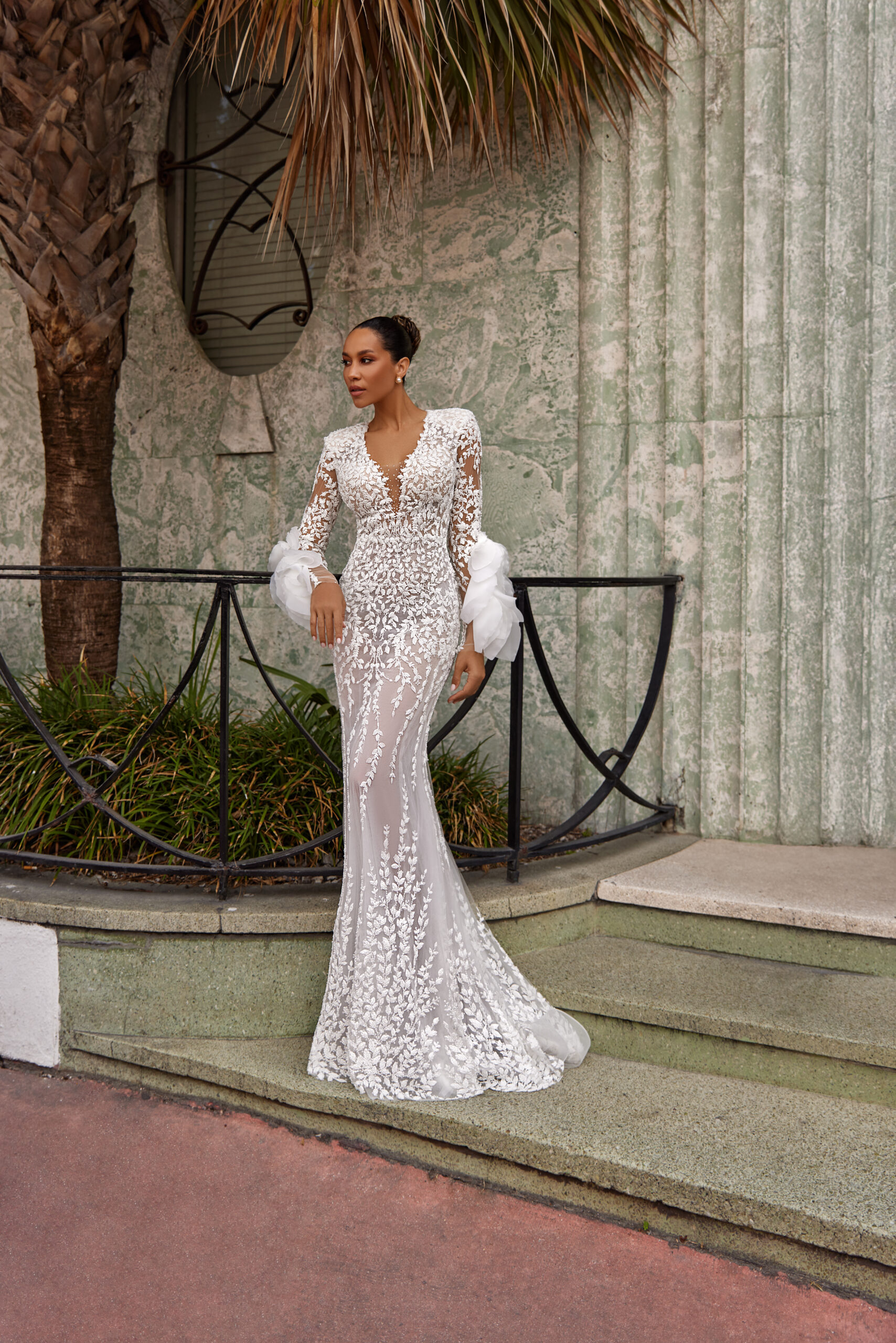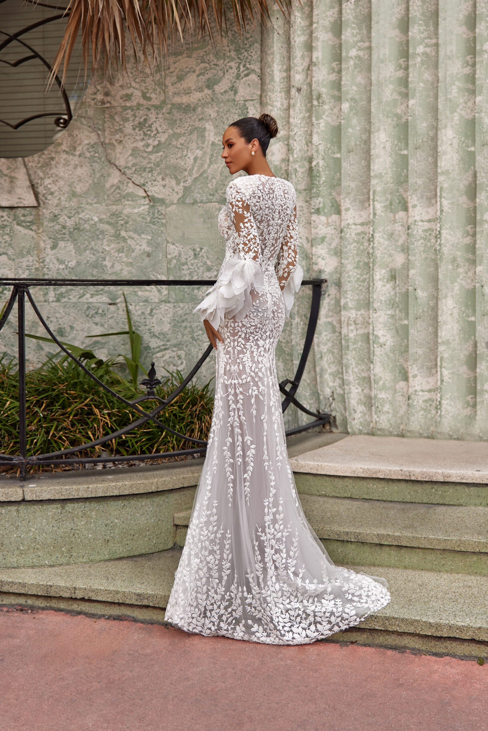 Απόλυτα θηλυκό νυφικό σε mermaid γραμμή με κεντημένες χάντρες σε σχήματα λουλουδιών. Μακριά μανίκια με εντυπωσιακό τελείωμα και V-neck λαιμόκοψη.