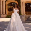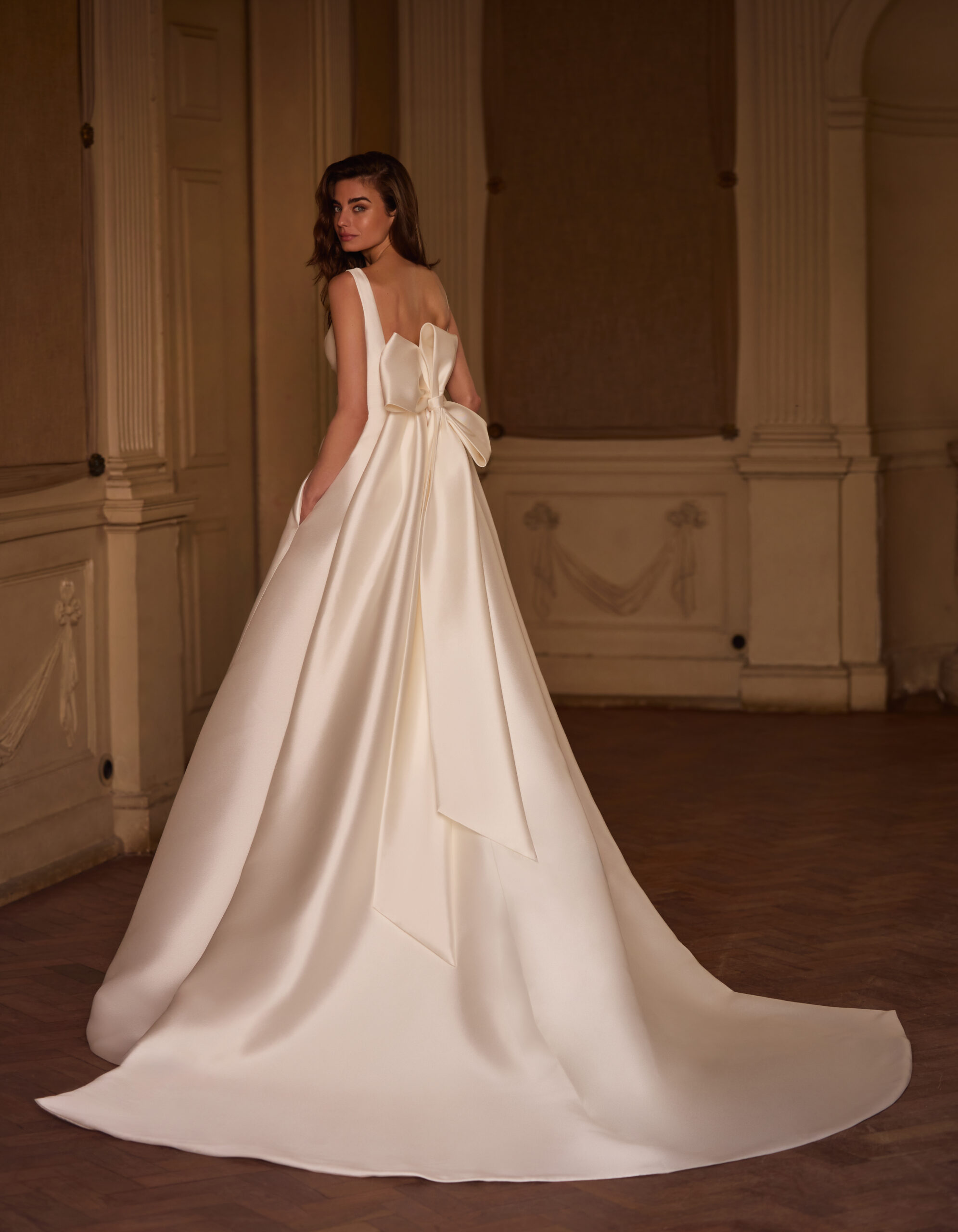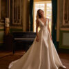 Κλασικό νυφικό σε γραμμή Α, φτιαγμένο εξ ολοκλήρου από mikado. Διαθέτει λαιμόκοψη boat neck και ανοιχτή πλάτη. Εντυπωσιακός και απόλυτα elegant φιόγκος και μακριά ουρά.
