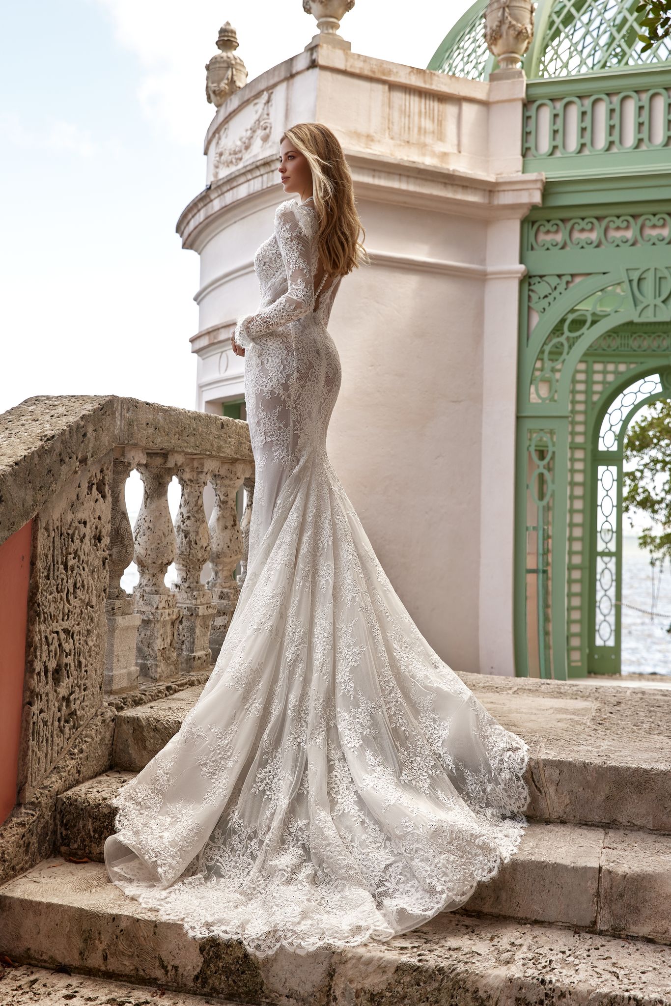 Ρομαντικό νυφικό φτιαγμένο από δαντέλα με μακριά μανίκια. Απόλυτα θηλυκό ντεκολτέ σε V-neck και ανοιχτή πλάτη. Η ένταση στους ώμους κάνουν την εμφάνιση επιβλητική.