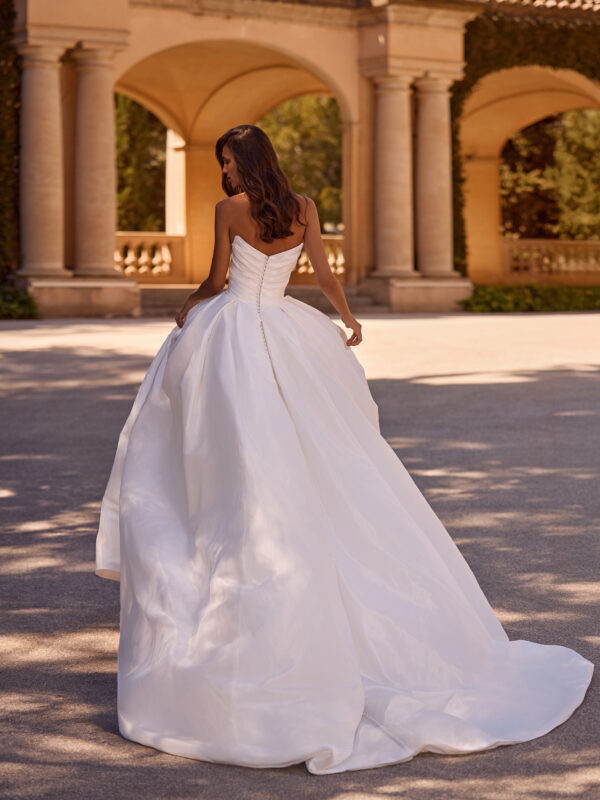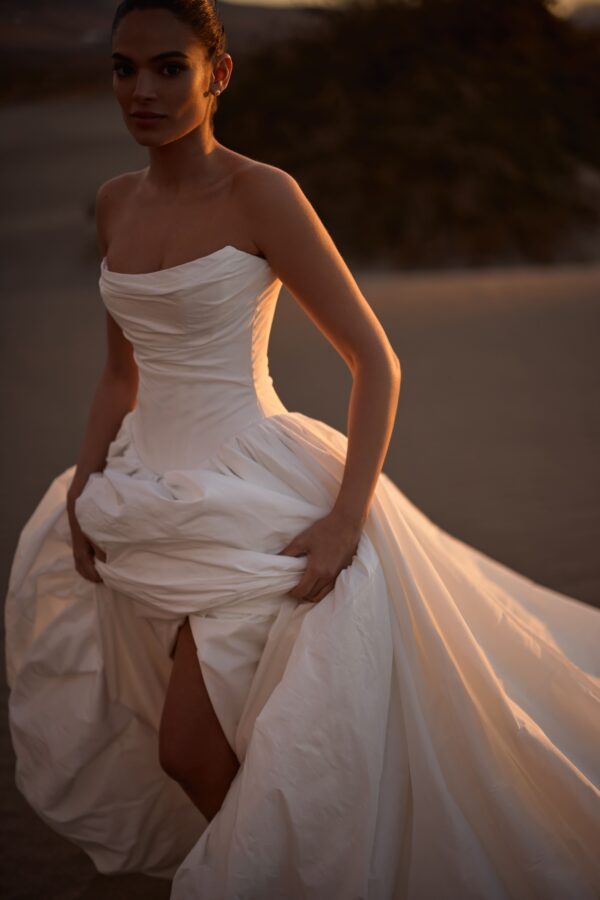 Κομψό νυφικό από mikado και off-the-shoulder μανίκια. Διαθέτει ντραπέ μπούστο διακοσμημένο με 3D απλικέ λουλούδια που τονίζουν τη λαιμόκοψη.