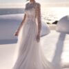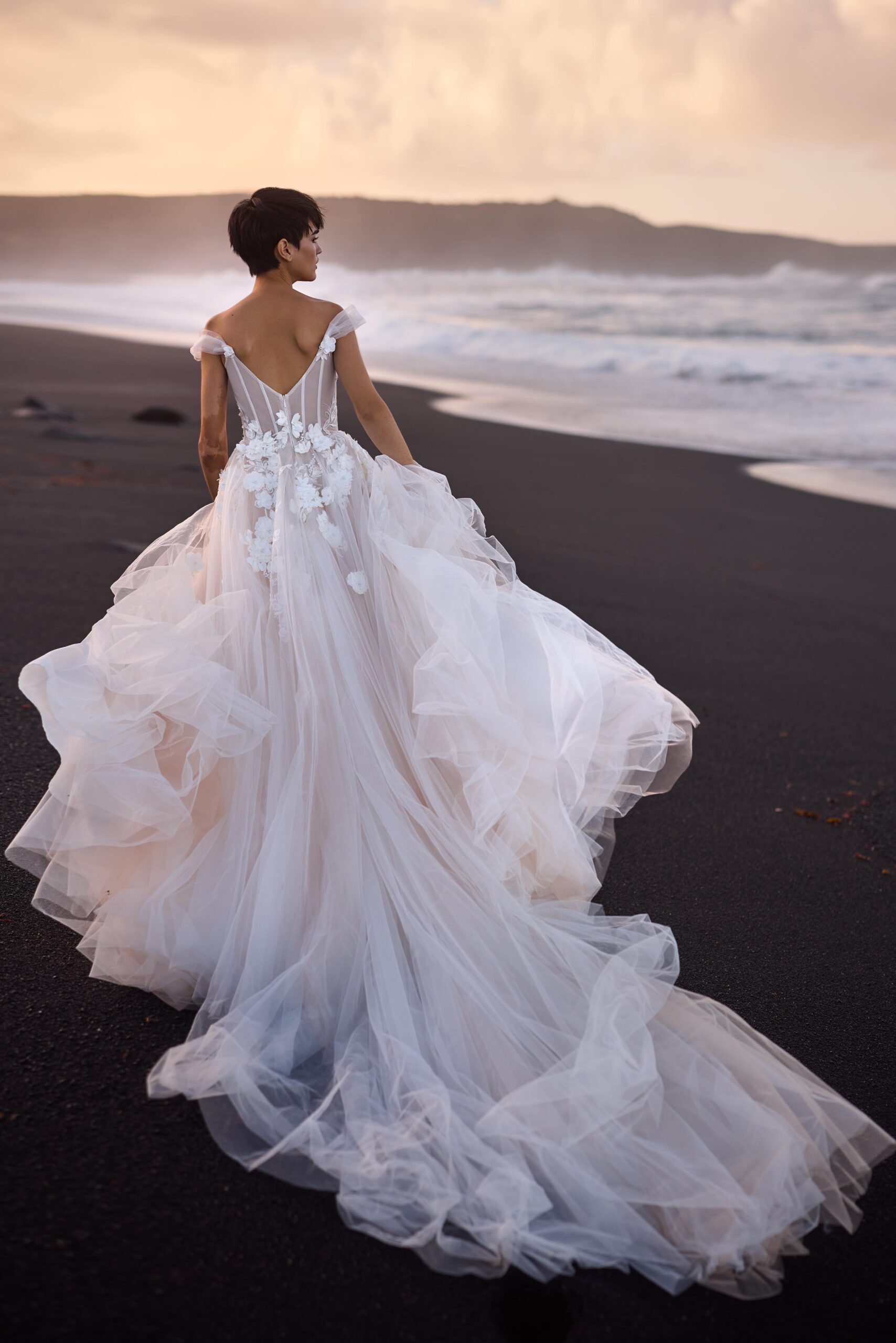 Ρομαντικό νυφικό φτιαγμένο από δαντέλα με 3d λουλούδια. Ντεκολτέ σε σχήμα καρδιάς και μανικάκι marriage off the shoulder. Μακριά πλούσια ουρά με σκίσιμο στο μηρό.