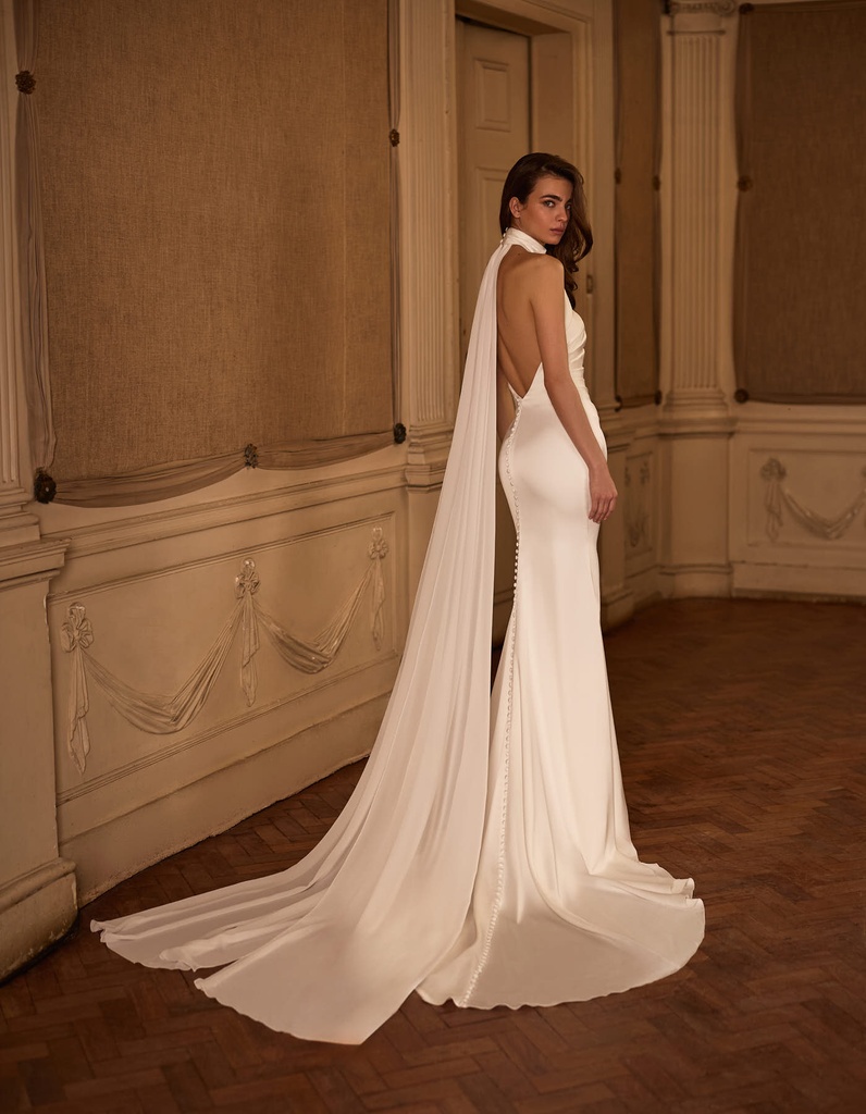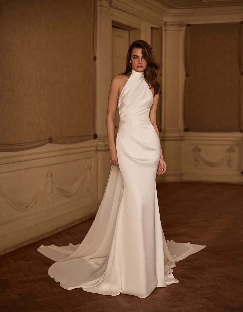 Απλό νυφικό σε mermaid γραμμή, φτιαγμένο εξ ολοκλήρου από απαλό σατέν. Διαθέτει ντραπέ μπούστο διακοσμημένο με δύο ουρές που εκτείνονται από το halter κλειστό ντεκολτέ.