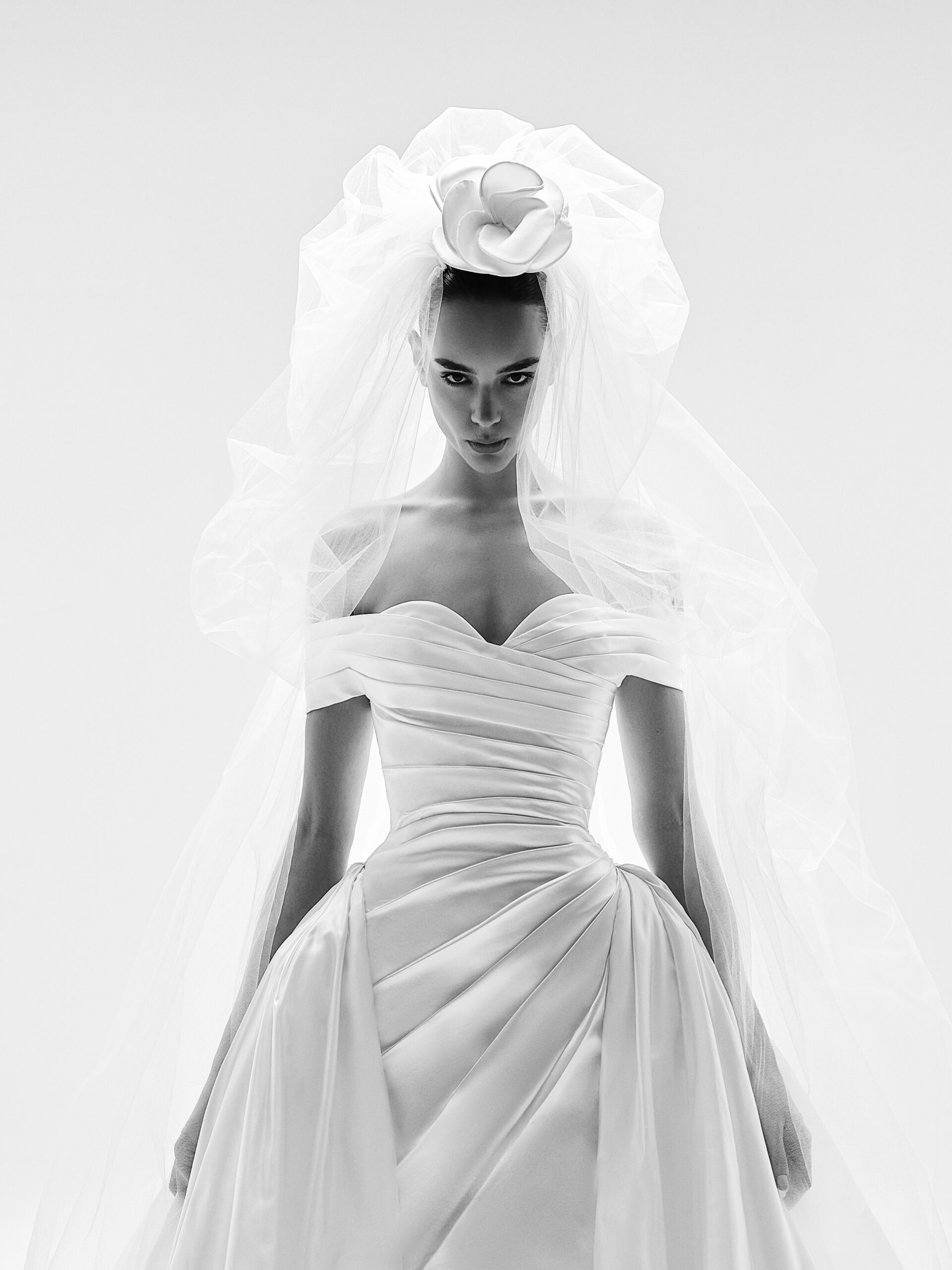 Elegant νυφικό από σατέν με off the shoulder μανικάκι και ντραπαρίσματα στο μπούστο. Ίσια γραμμή και μια overskirt που κάνει την εμφάνιση αριστοκρατική.