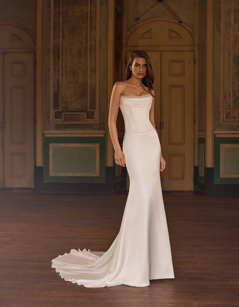 Μοντέρνο νυφικό σε σχήμα γοργόνας που συνδυάζει μπούστο με κορσέ, κέντημα με χάντρες στο ντεκολτέ και φαρδιά σατέν φούστα.